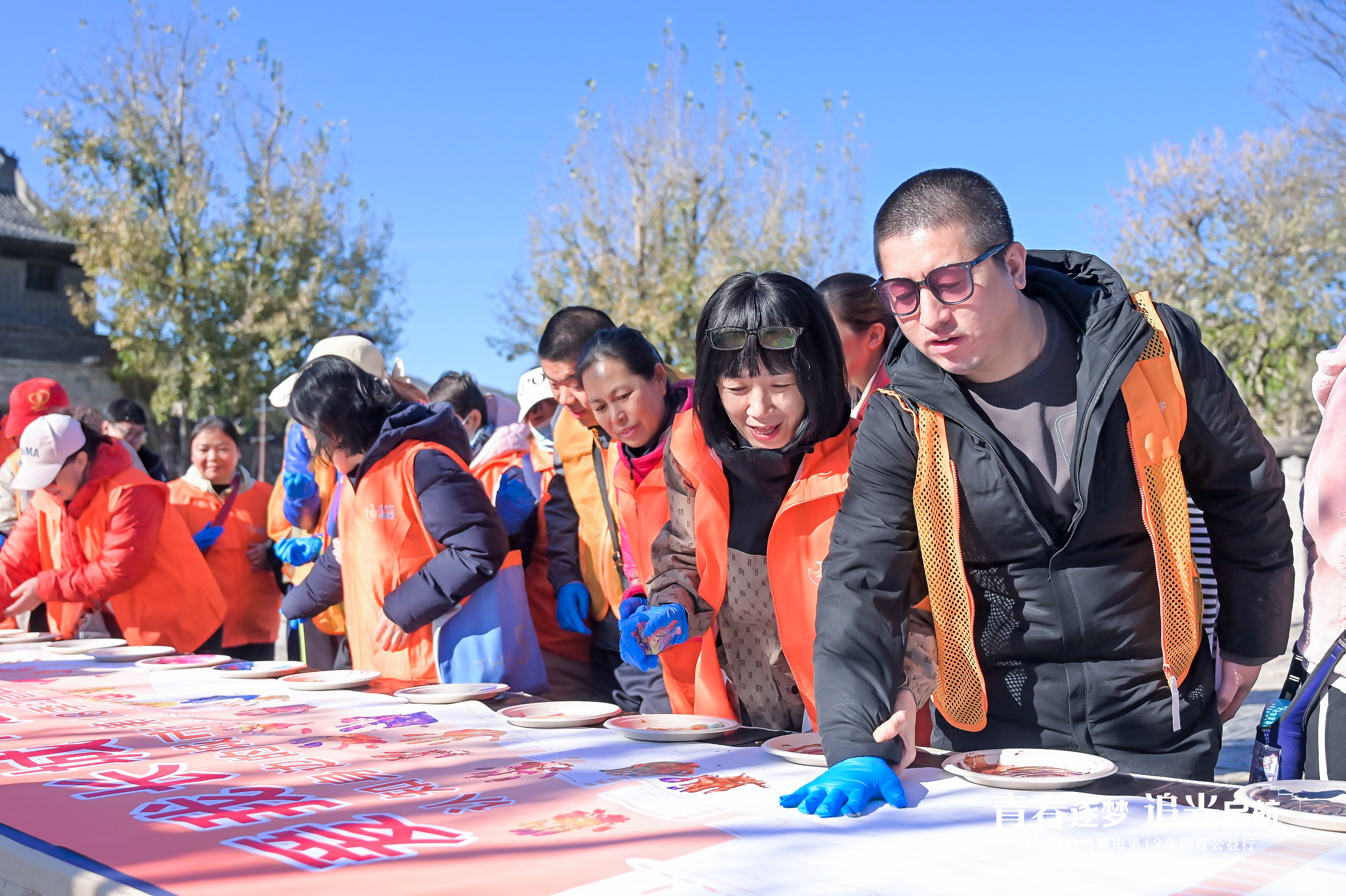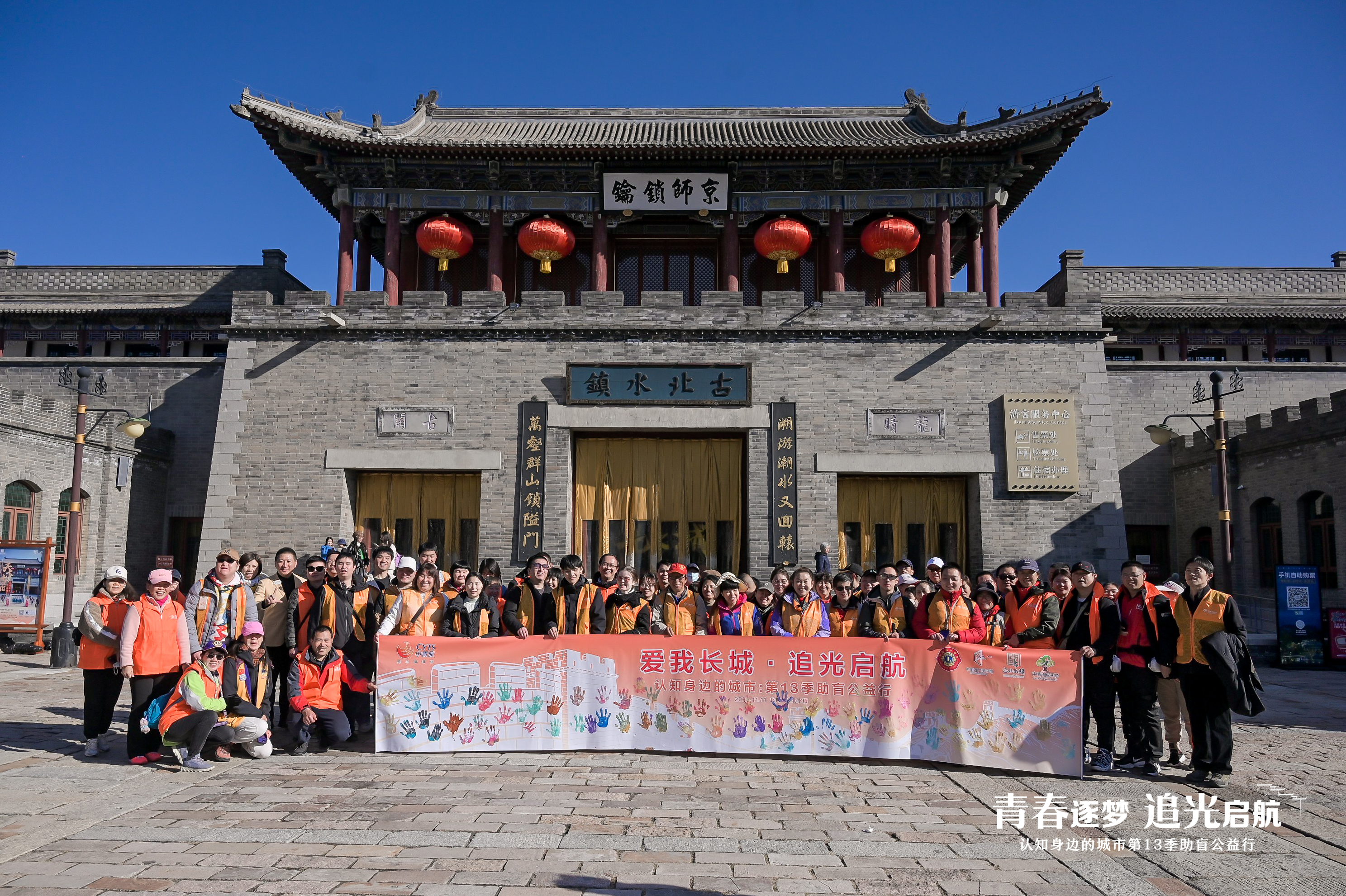 活动伊始,水镇广场上的“汇聚七彩巧手,拓印长城画卷”环节温情满满。参与人员佩戴专用手套,在长城主题画卷上按下专属掌印,以触觉共创文化记忆,勾勒爱我长城的七彩图景。志愿者们用细腻的语言描述画卷的图案、线条与色彩,让长城雄姿在大家的手中徐徐展开,代表热忱服务的志愿橙与勇敢追光的逐梦蓝交相辉映,在古北水镇的古朴意境中,定格成一道道温暖人心的风景线。